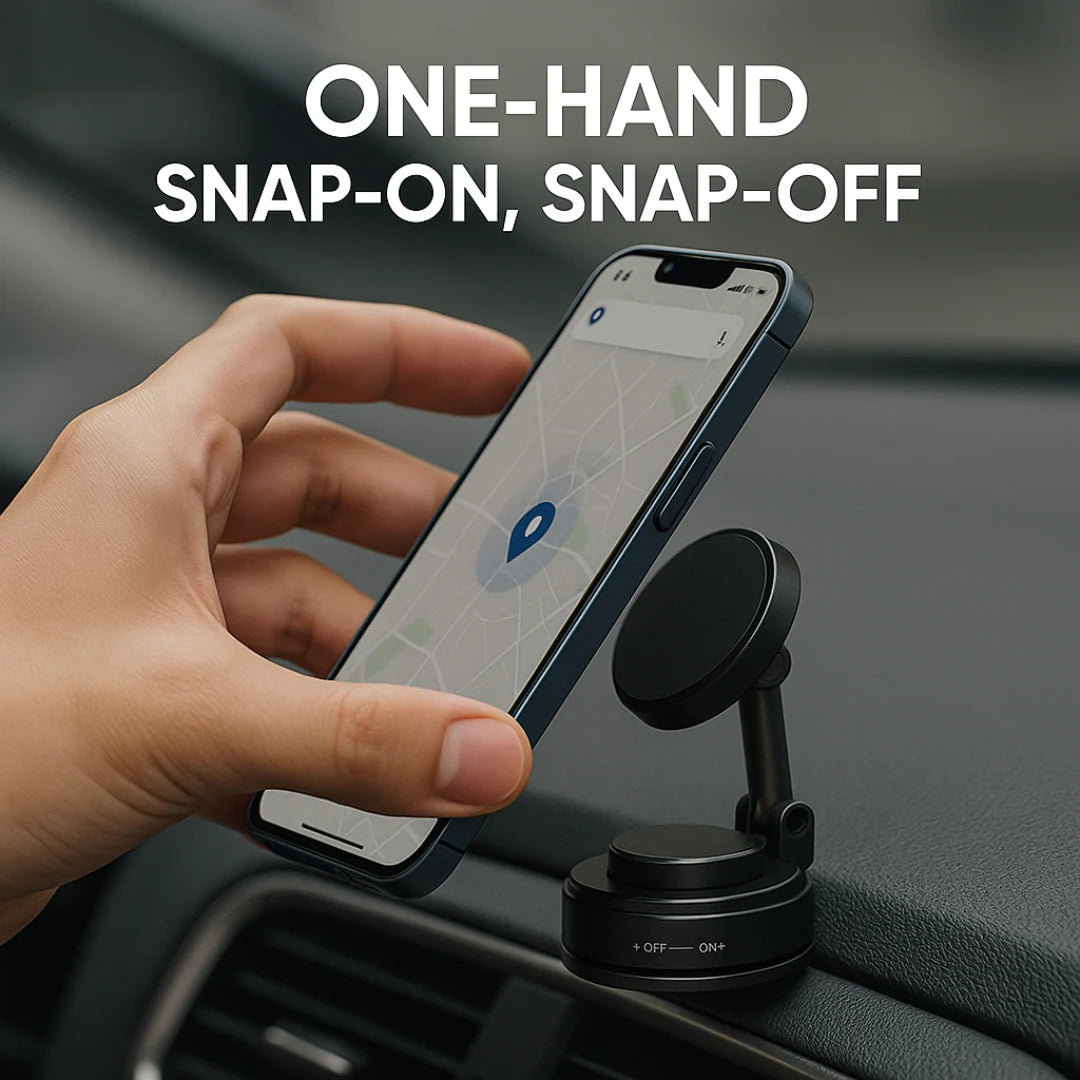No clamps. No buttons. No frustration. Just bring your phone close to the magnetic base, and it instantly locks in place. When you’re done, just lift it off – all with one hand. This means less distraction and more safety on the road.